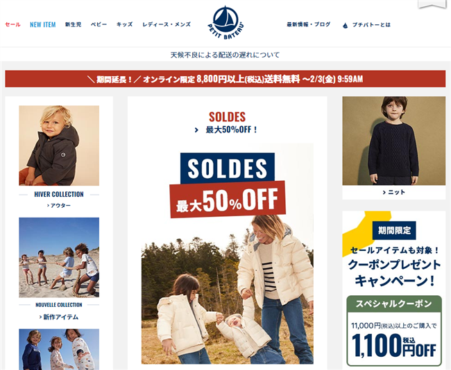 プチバトー公式サイトでは、キャンペーンなどでお得なクーポン情報を告知している場合があります。